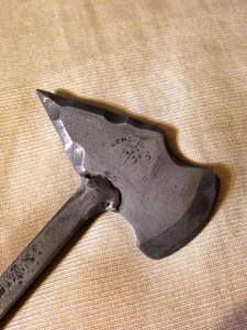 The blade is serrated on one side like many other shovels of this size. And like most of it’s counterparts, the serrated edges as well as the blade edge need to be sharpened with a file. This is not a criticism. A few minutes with a file and the serrations and flat edge are nice and sharp. Again, most shovels of this type need to be sharpened. The three rivets that hold the blade to the mount seem solid. At 2 lbs. weight, it is solid enough to pound tent stakes in soft to moderately hard soil. I took the shovel out back and used both the pick and the blade to dig around a bit. The soil here is gravely on top, sandy under. Both the pick and blade worked well and the locking nut stayed tight. There were no dings or bends to the blade.