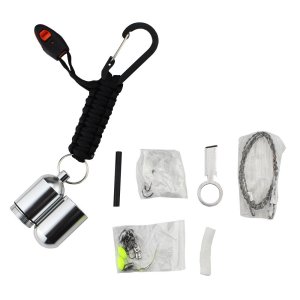 3 Fishing lines 2 x Hooks 2 x Weights 2 x Floaters 2 x Sinkers 2 x Swivels 1 Knife 1 Tinder cotton 1 Ferrocerium rod 2 Safety Pins and 1 cable saw