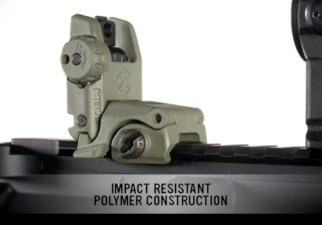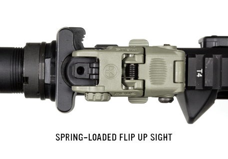 a folding Magpul® MBUS®. This is a spring-loaded flip-up sight with two apertures. The smaller aperture is for fine shooting and the larger is for CQB applications. The rear sight is windage adjustable only as elevation adjustments are done on the front sight. ( Please note that the sights that came with my rifle are black and not green as pictured. These photos are from the Magpul site and the sight comes in various colors)