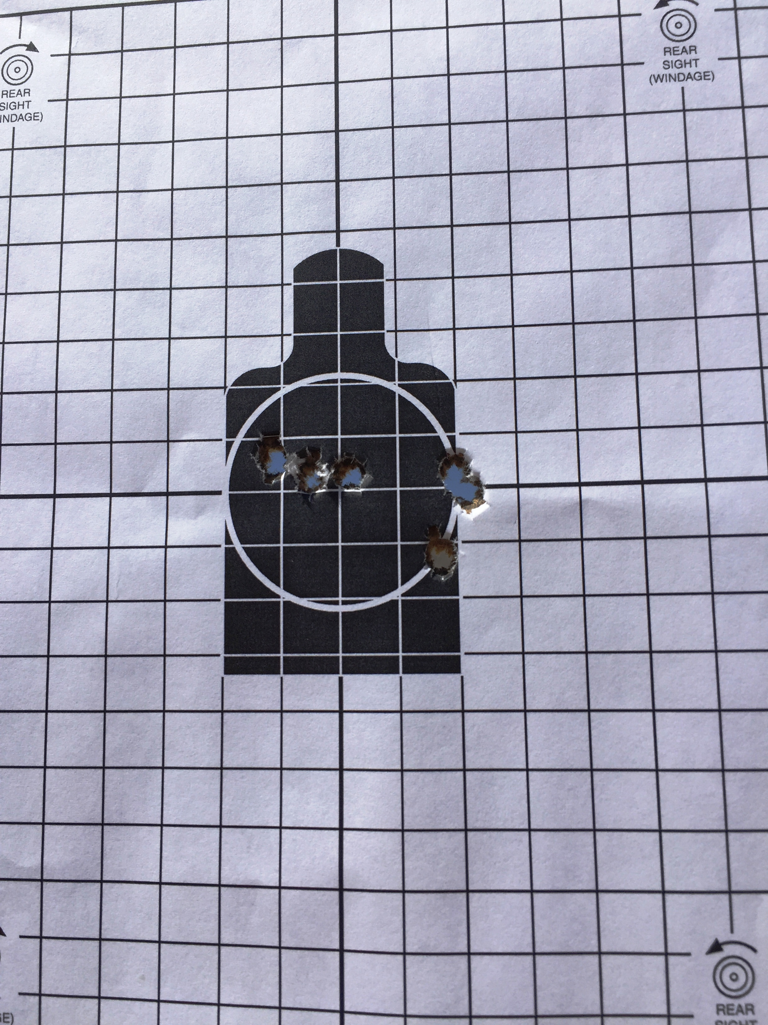 zero groups were three shot groups using the small sight aperture . The first group was way low right. I made a sight adjust ment and was then a bit high left. I then went to the second target (pictured) first group slightly right, and the second in the center. After getting a 25yd zero, I then moved the target out to 50yds and did three shot drills on a silhouette target. The rifle grouped nicely in the center chest area. I then moved it out to 100yds and did three shot timed fire drills from the bench. The group was nice and tight in the throat area. I brought the front sight down a bit so I was hitting a bit high in the chest area. I wanted a good 100yd zero, as this is the maximum range I would probably use this rifle at most of the time. I then moved the target back to 50yds and did Mozambique drills ( two to the chest, one to the head) from the standing ready position using the larger CQB aperture for the remainder of the ammunition. All chest shots were centered and all head shots were also, with no flyers. This is one accurate little rifle! I fired a total of 120 rounds out of four brand new magazines with no malfunctions. My next range foray I will try it with M-885 ball and see what zero and accuracy changes might ensue.