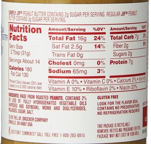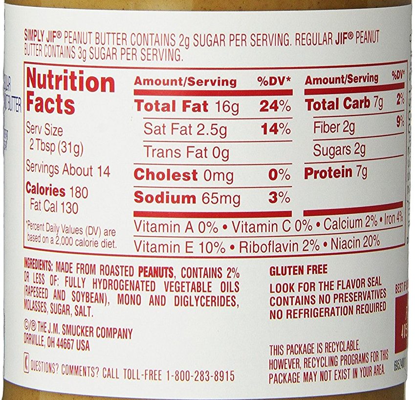 This is the label off of a regular jar of Jif creamy peanut butter. It also has 7 g of protein, but has 180 calories, and 16 grams of total fat