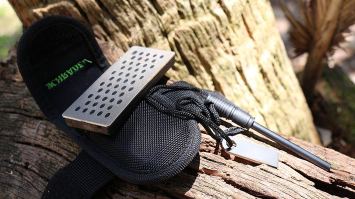quality sharpening tool in a detachable pouch as well as a ferro rod fire starter.