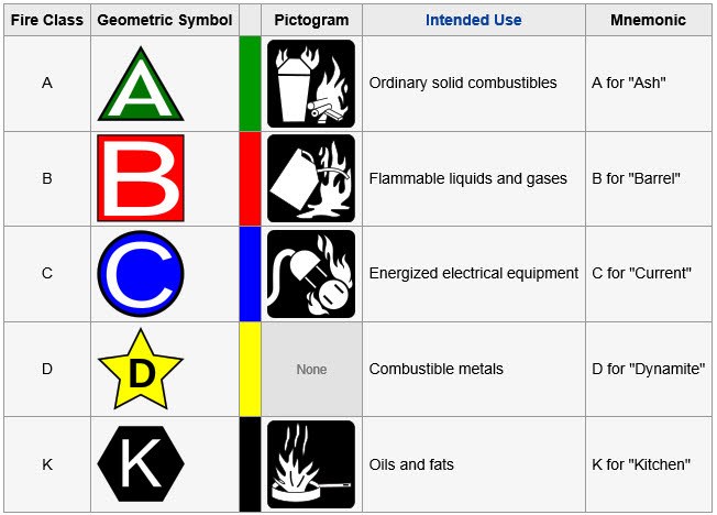 There are different classifications of fire extinguishers based on the type of fire they are designed to put out. The following chart shows the classifications as they apply to the United States. The UK, Europe, and other parts of the world use different classifications symbols and markings but the concepts are similar.