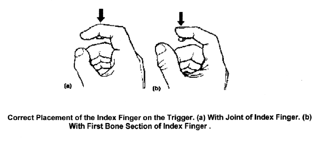 Trigger finger placement is very important. The idea is to find that spot on the trigger where you can pull the trigger straight to the rear. Too much finger and you will tend to pull the shots to the right (right handed shooter). Too little, and you will tend to push the shots to the left.